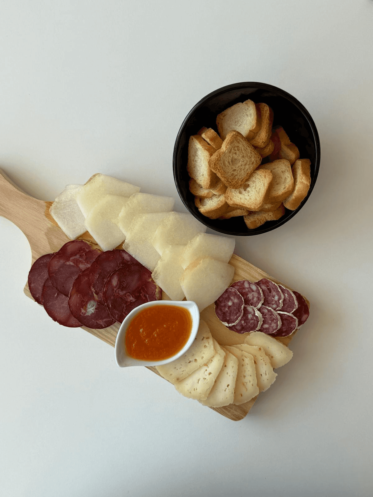 2 Variedades de enchidos, 1 Fruta, 1 Compota, 1 Queijo e Tostas
