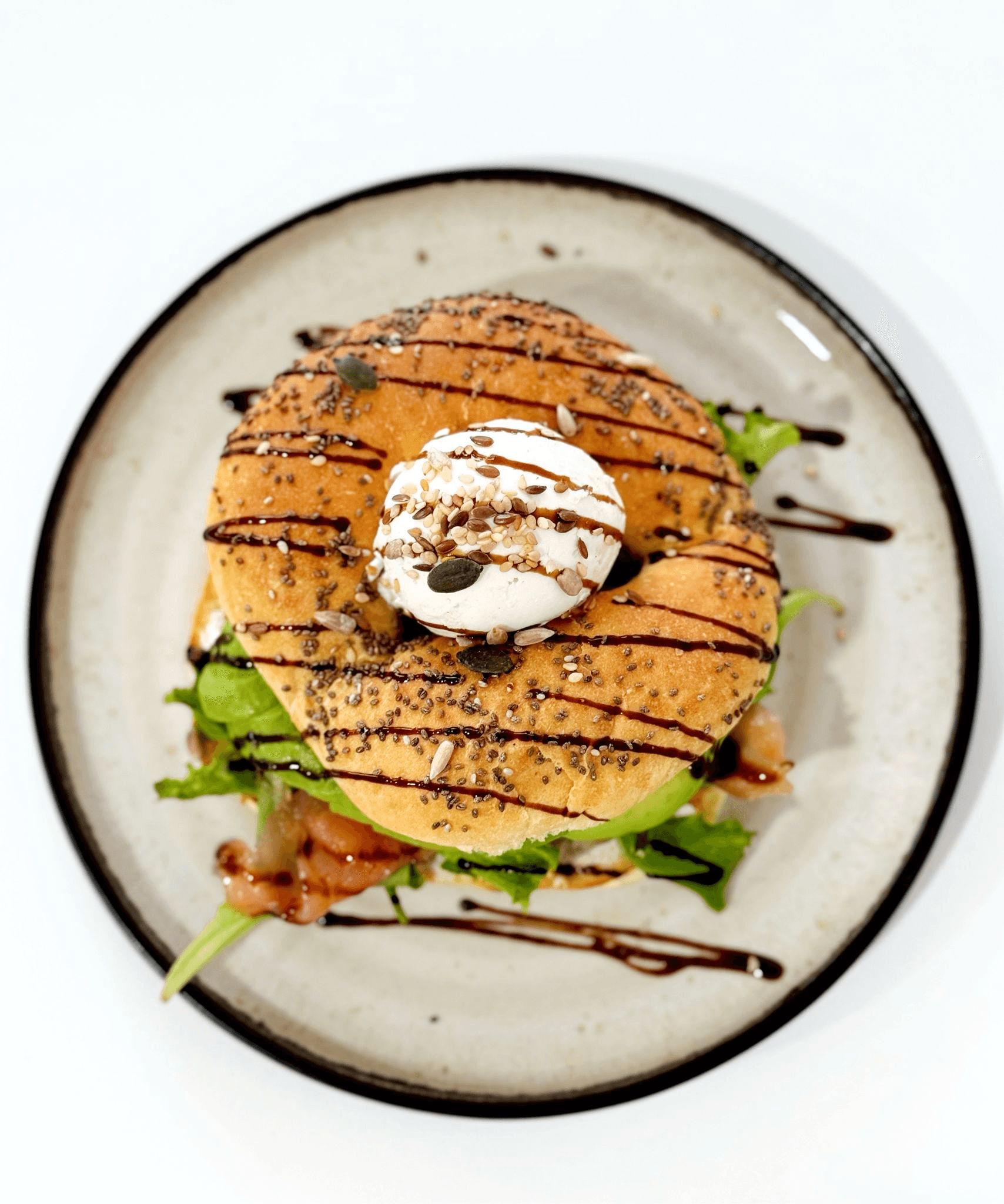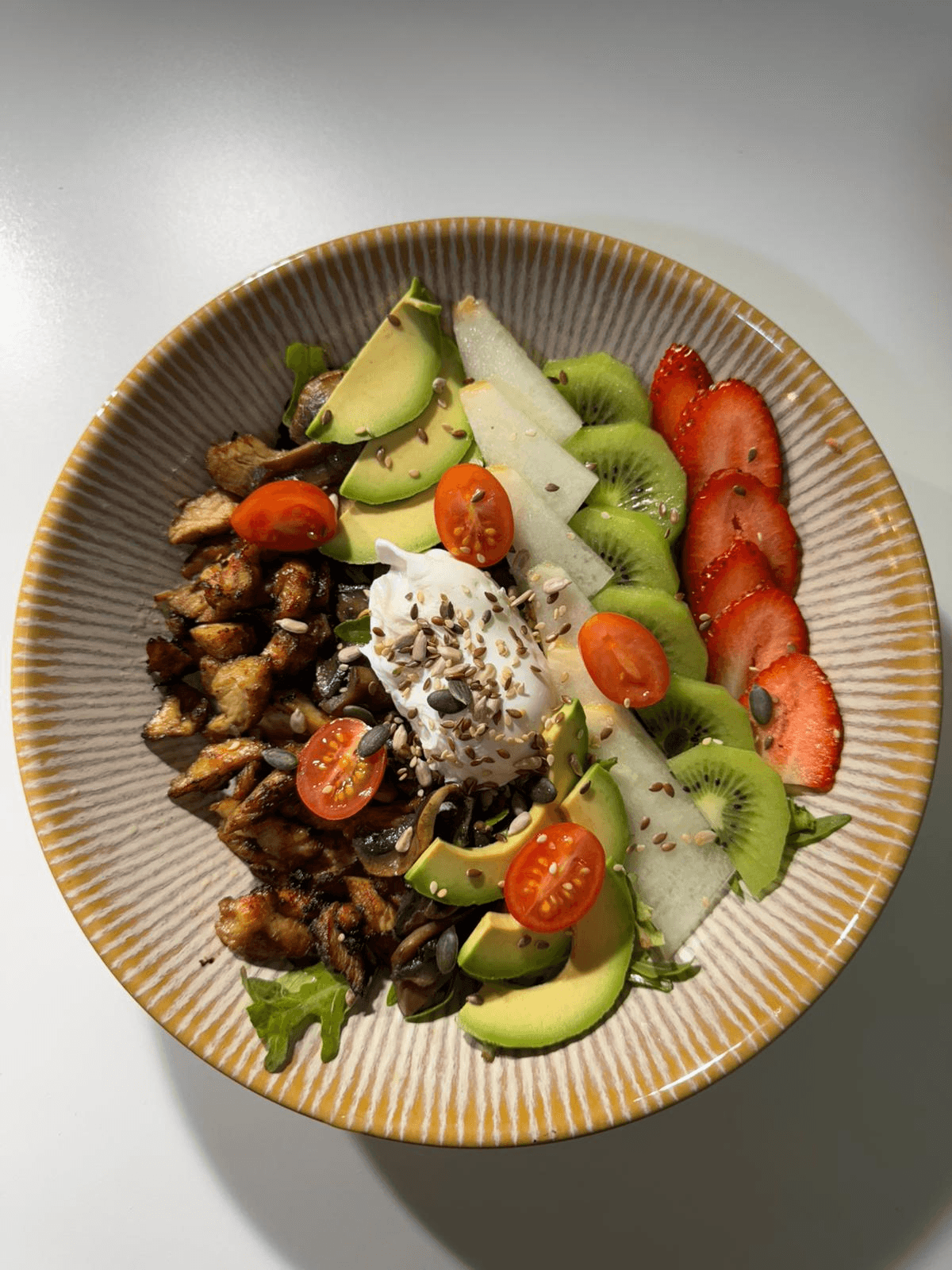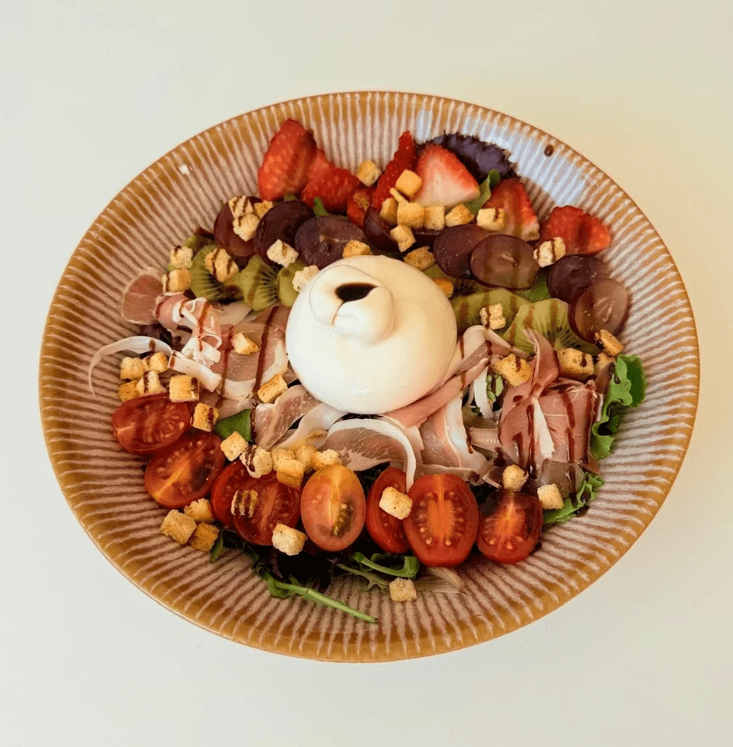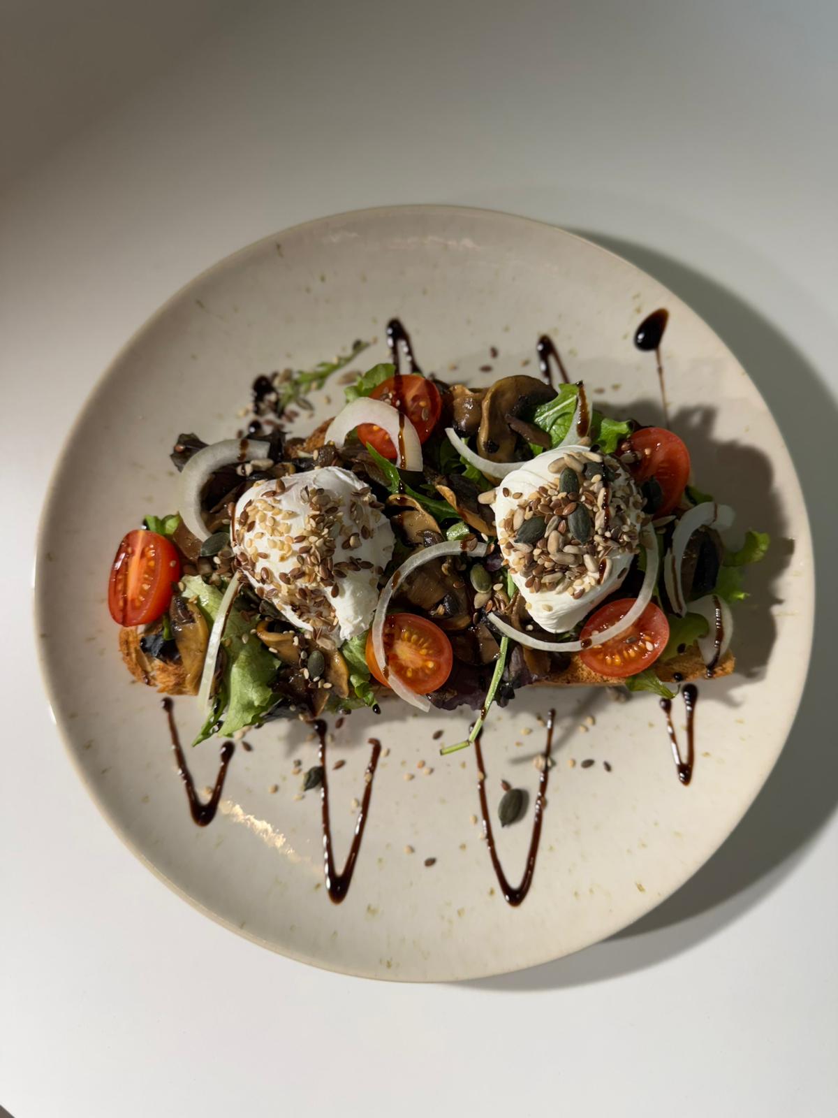 Queijo Creme, Mix de Alfaces, Tomate Cherry, Cogumelos Salteados, Cebola Fresca, Ovos Escalfados