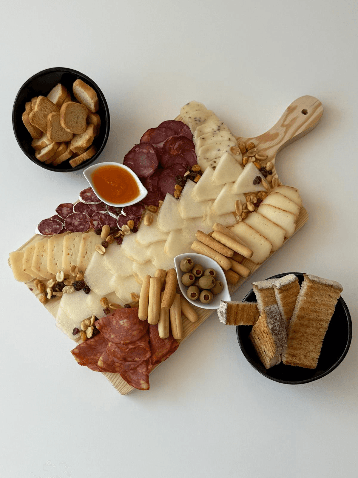 3 Variedades de enchidos, 3 Variedades de queijo, 1 Fruta, 1 Compota, Grissinis, Azeitonas, Frutos secos, Tostas e Pão