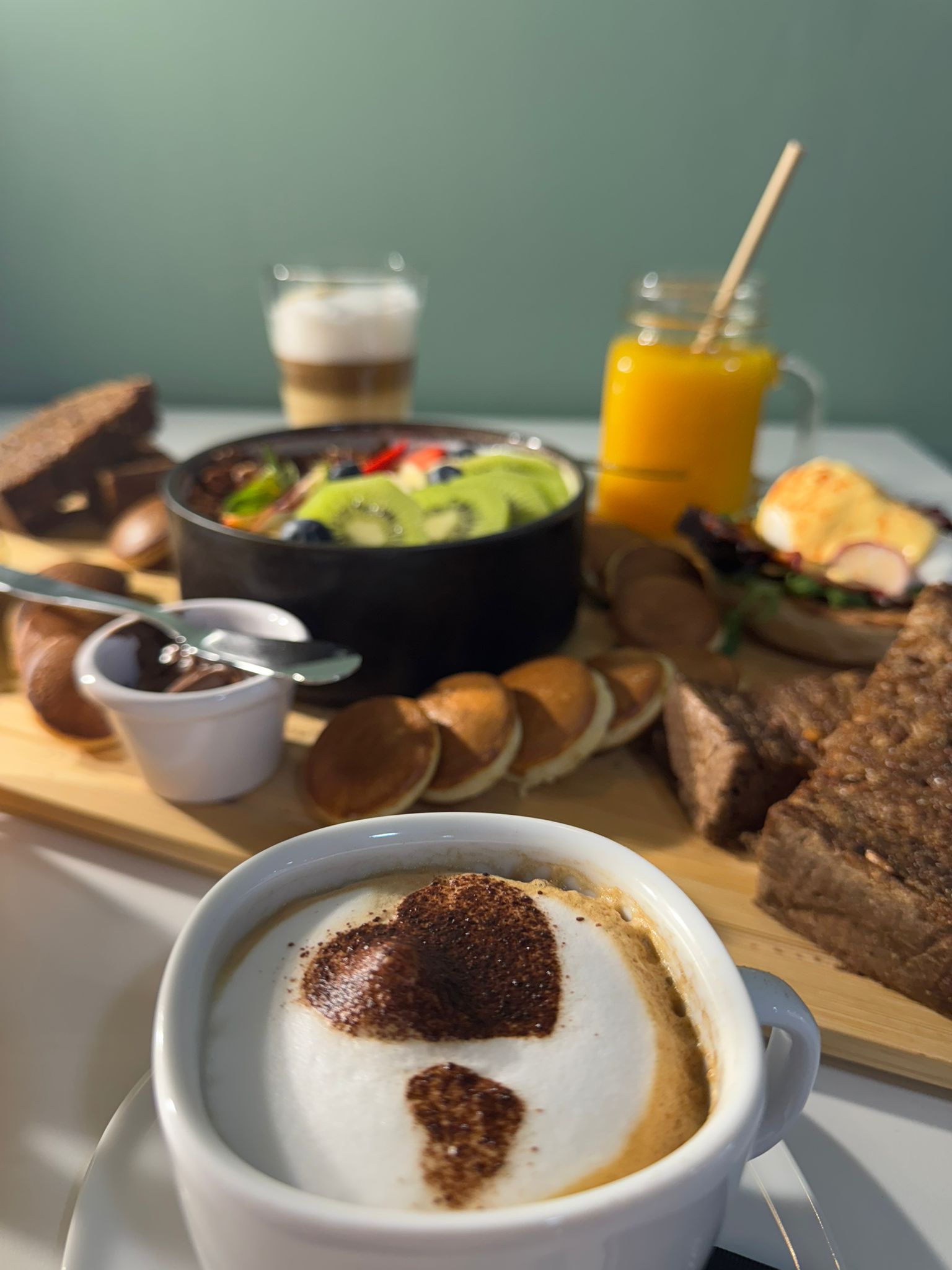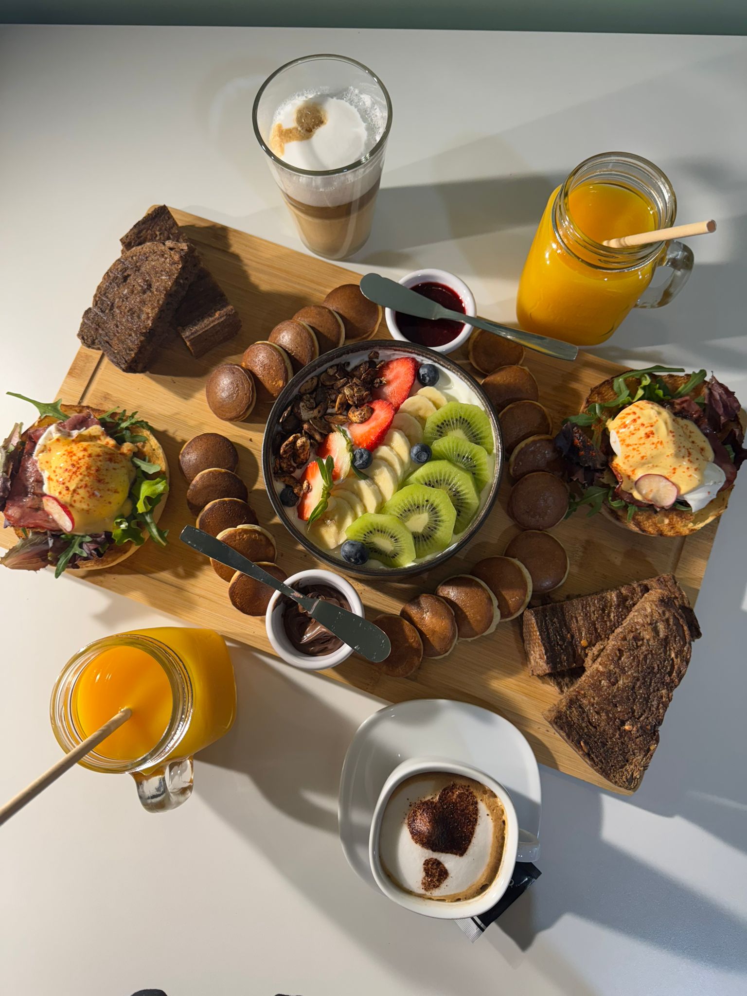 2 Sumos de Laranja, 1/2 Torrada à escolha, Eggs Benedict em Pão do Caco, Mini panquecas com 2 Toppings, Bowl de Iogurte c/ Muesli, 2 Bebidas Quentes