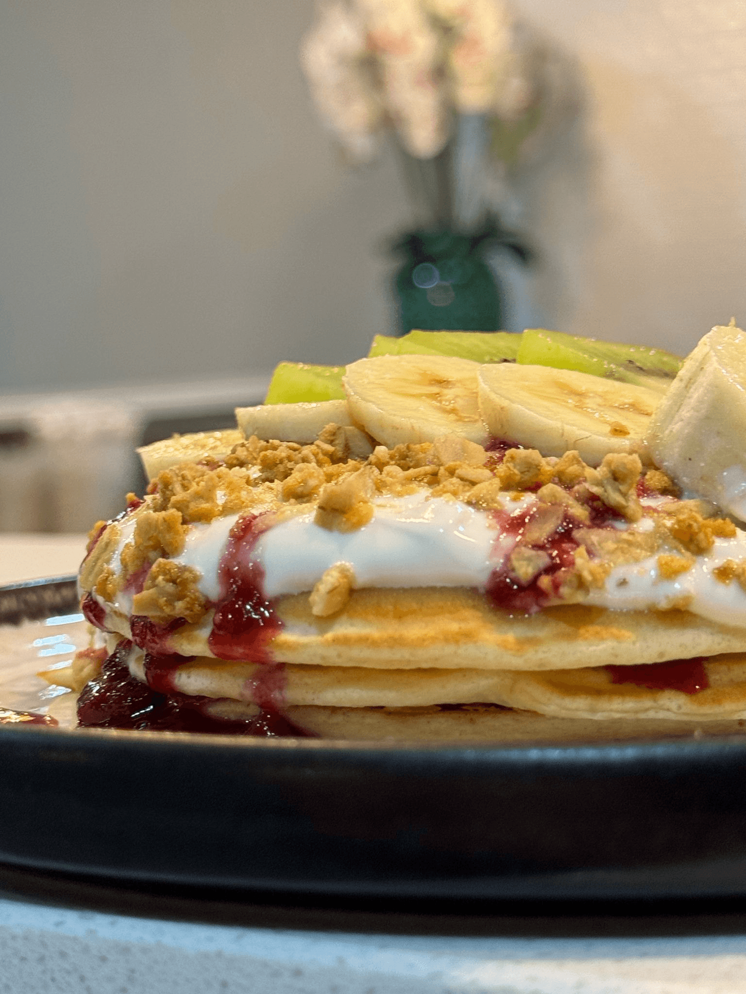 Panqueca, Frozen Yogurt, Fruta e um Topping