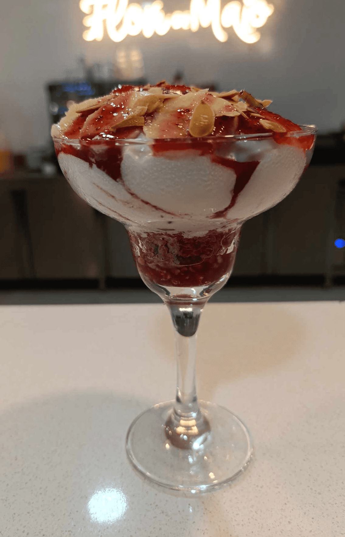 Gelado de Morango, Topping de Morango, Morangos, Bolacha Wafle e Chantilly
