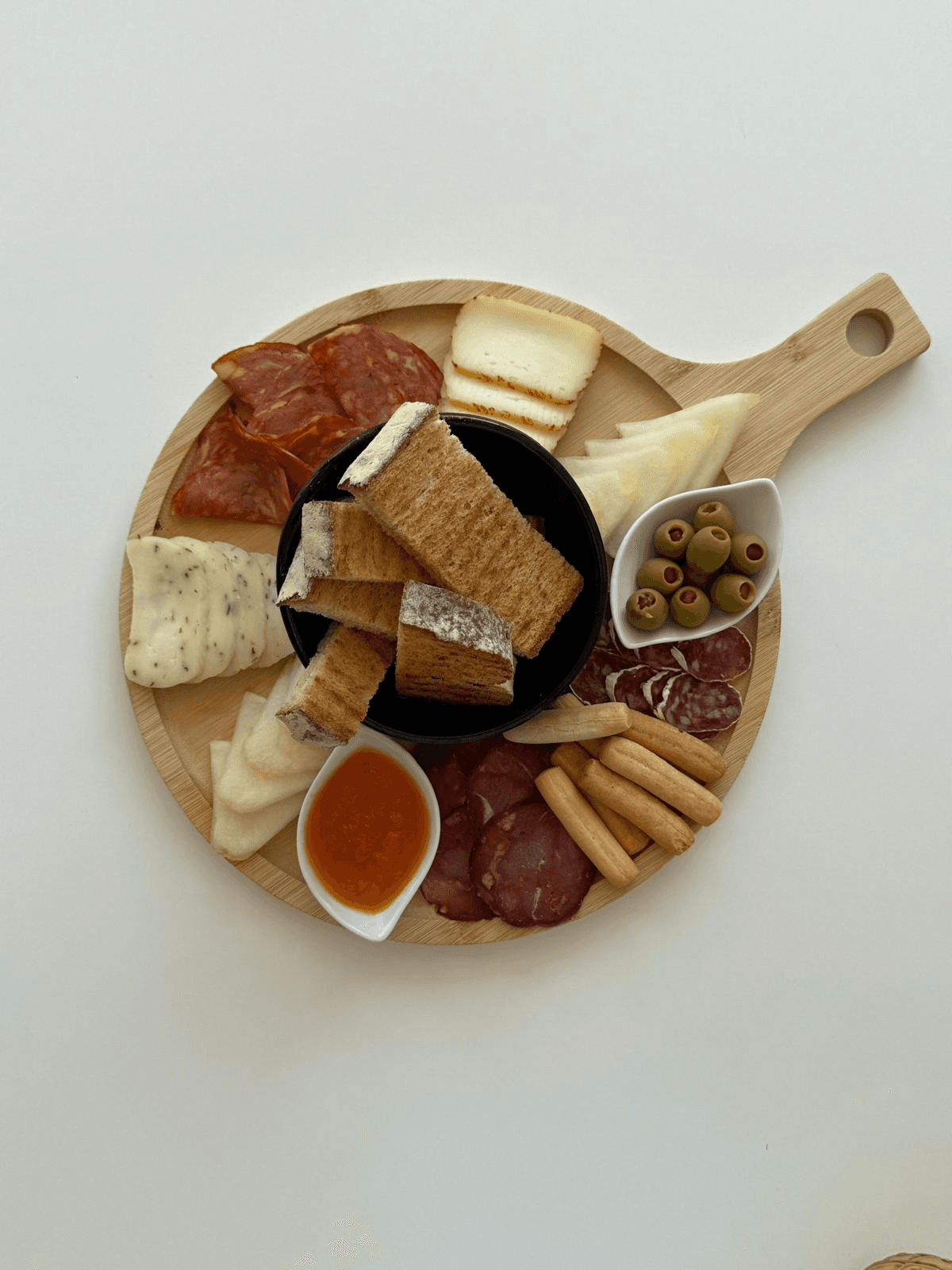 3 Variedades de enchidos, 2 Variedades de queijo, 1 Compota, 1 fruta Azeitonas, Grissinis, e Pão