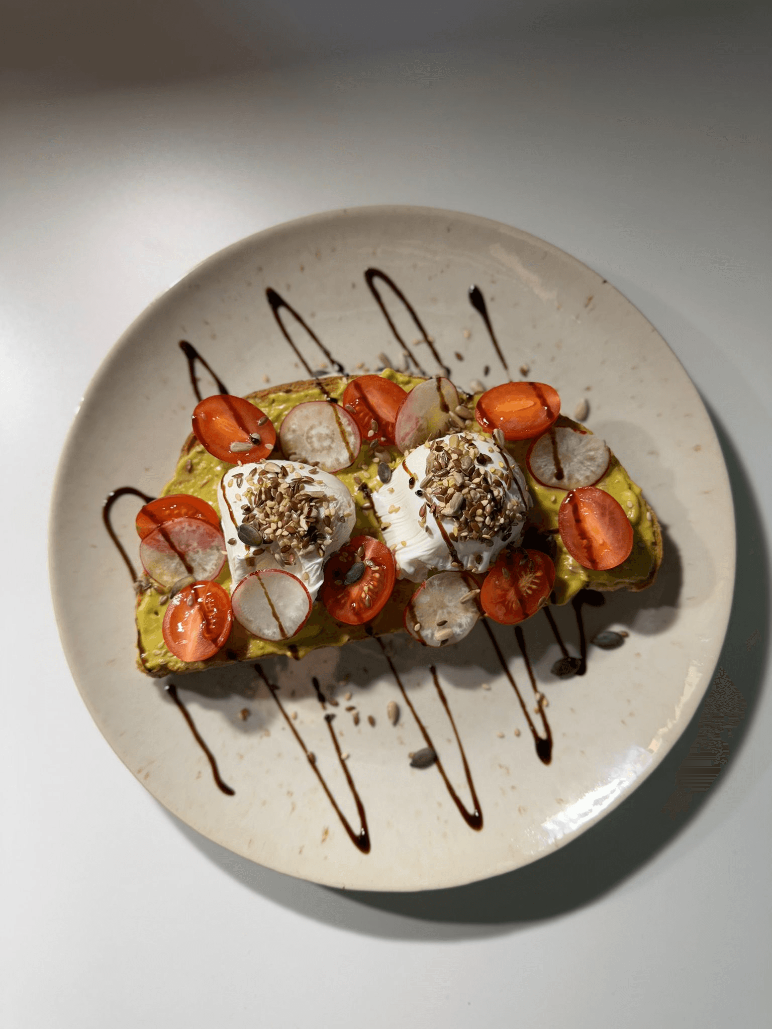 Guacamole, Tomate Cherry, Rabanete, Ovos Escalfados, Molho Balsámico