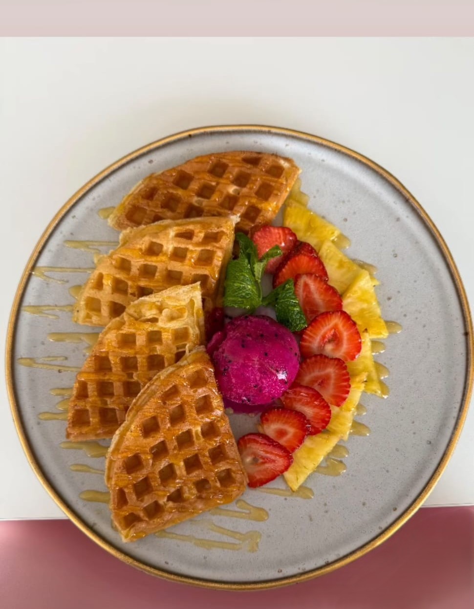 Gelado de Nata, Abacaxi, Morango, Topping de Morango e Manga, Bolacha Waffle e Hortelã